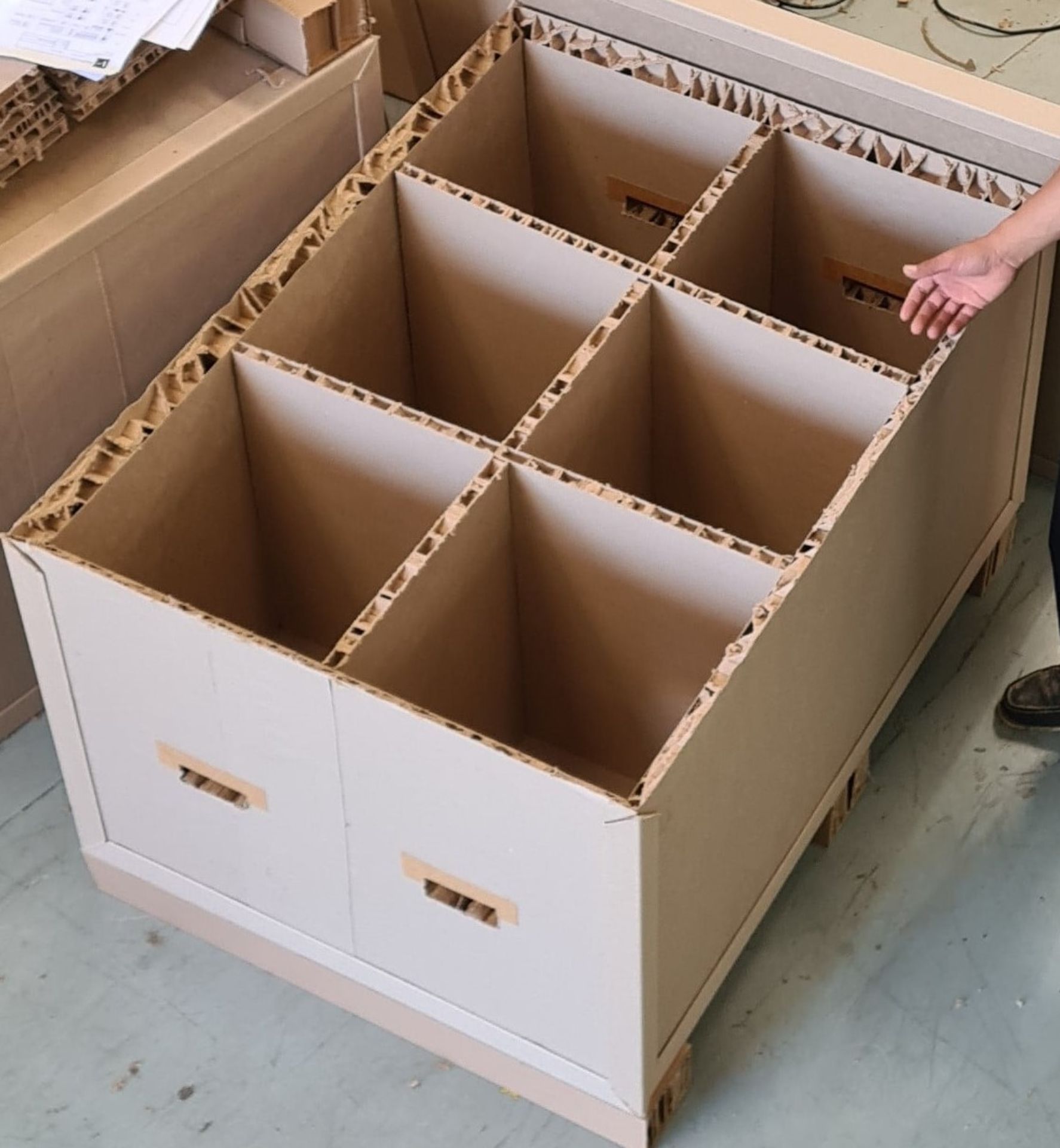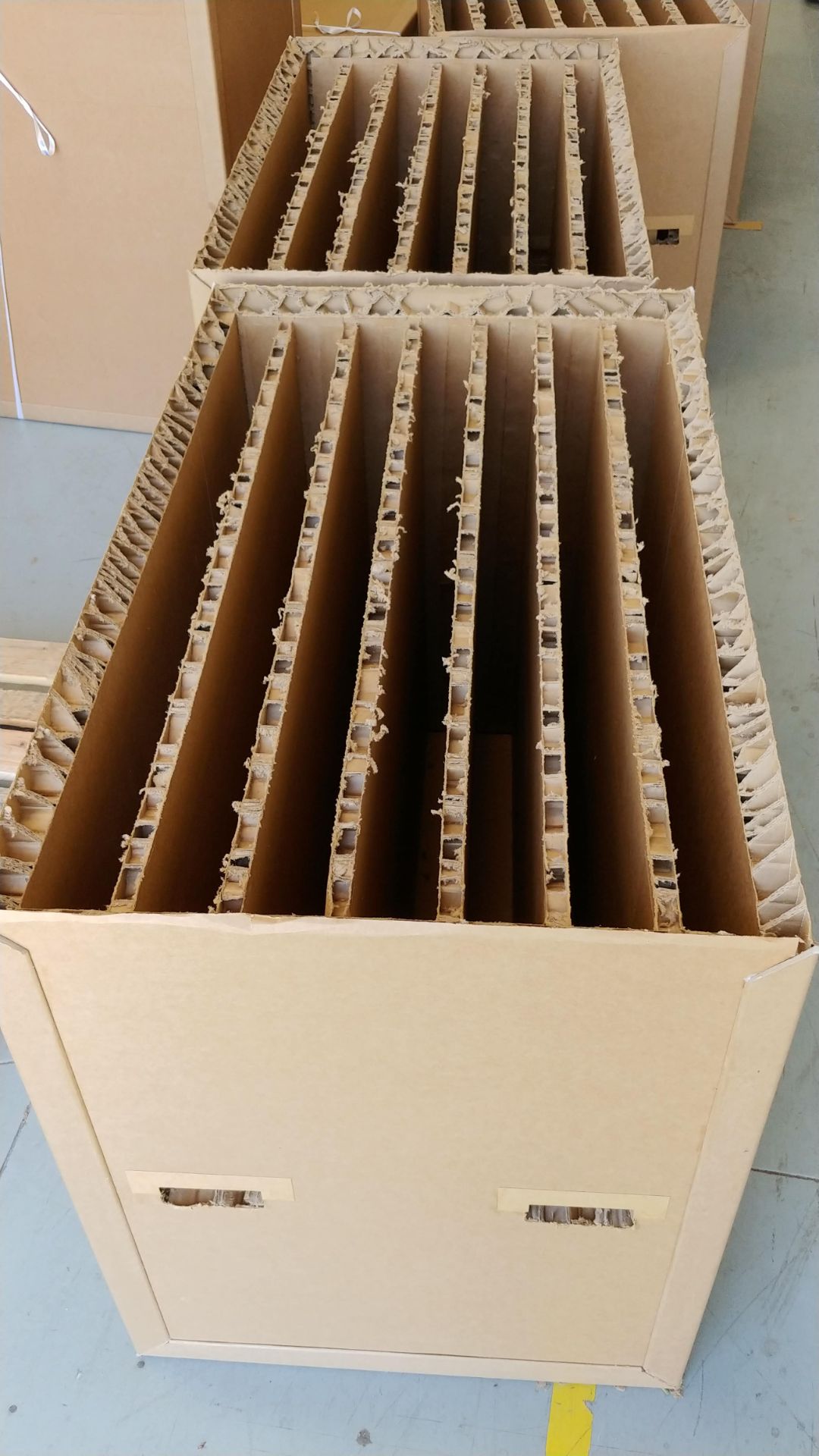 We manufacture bespoke cardboard honeycomb crates, panels (pallet bases), pallets and bins in partnership with Ubusi©. What makes our products unique is that the honeycomb structures used are made of b-flute cardboard - thus creating a 'structure within a structure' and providing superior strength to all of our products. All of the products we manufacture are made from recycled materials and are in and of themselves fully re-usable and recyclable.